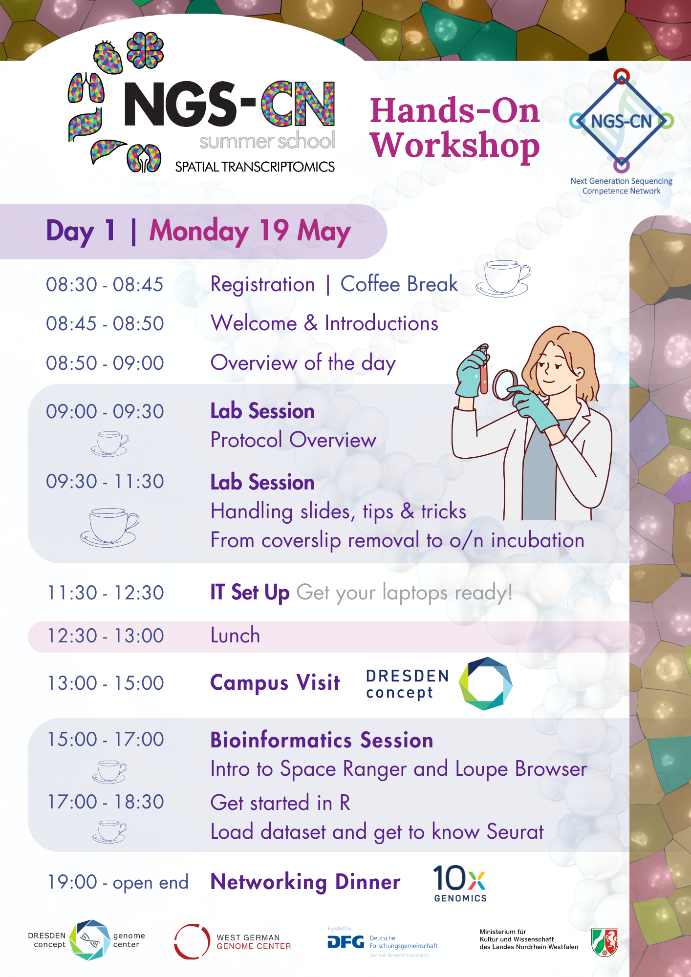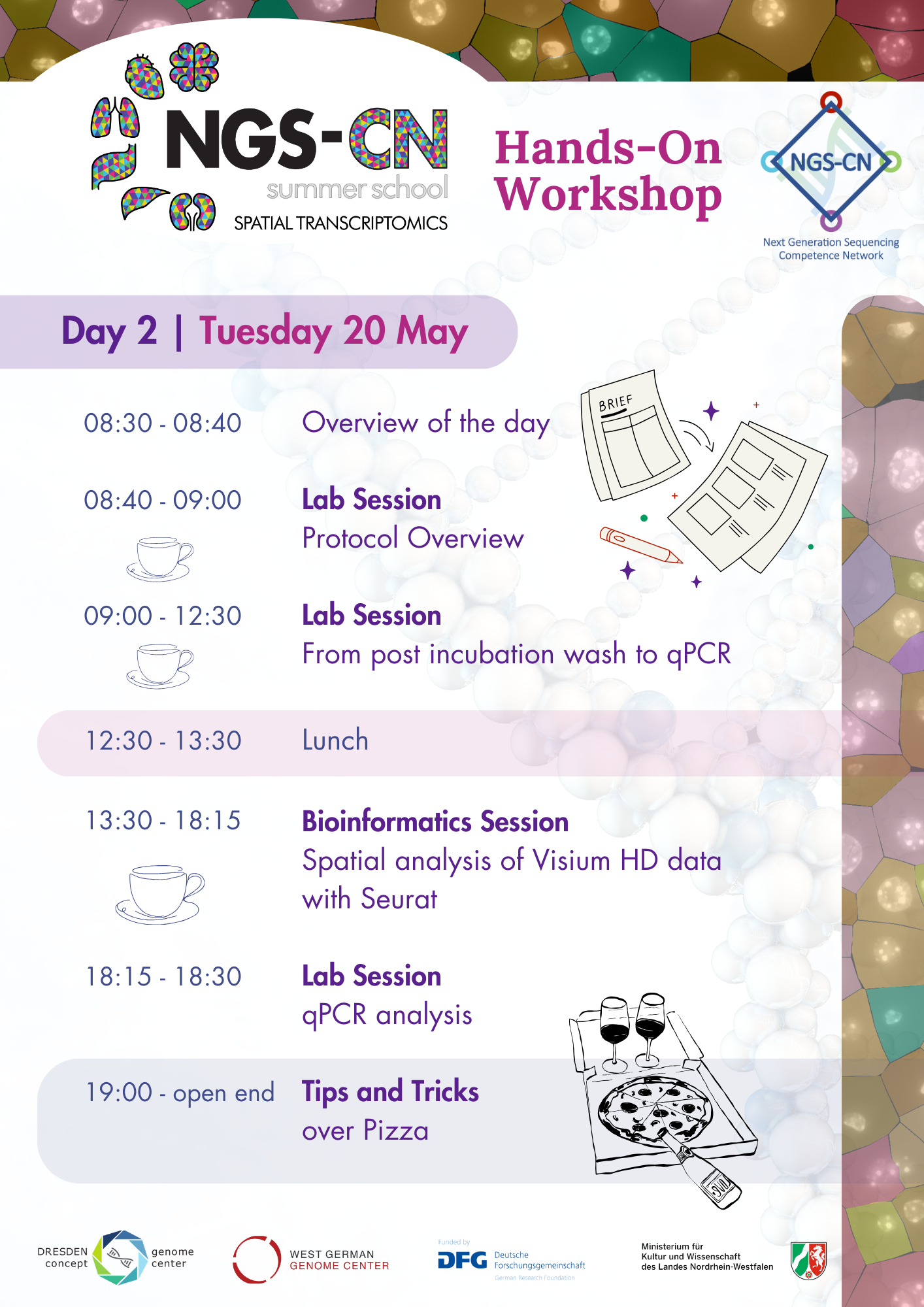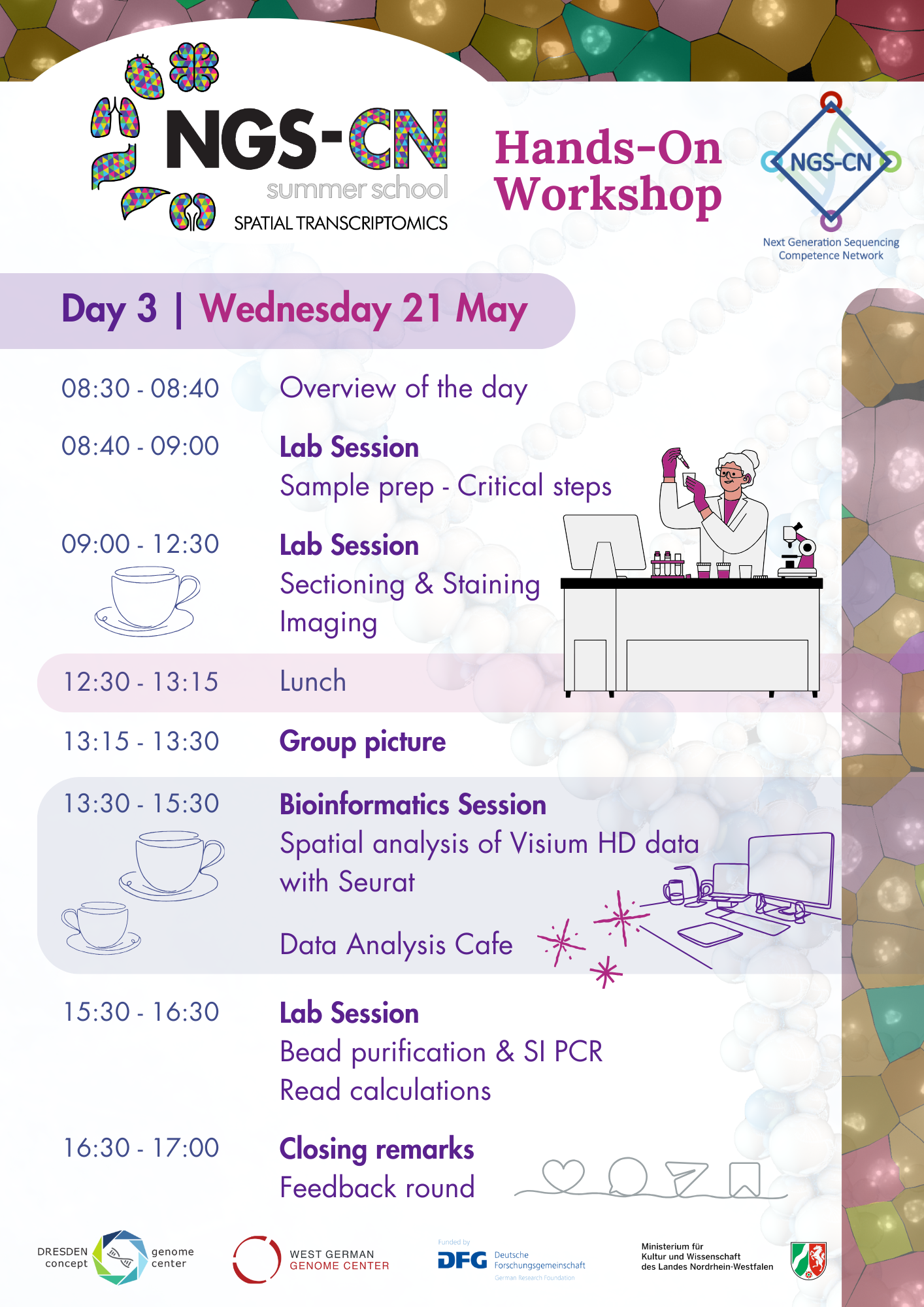 The Next Generation Sequencing Competence Network (NGS-CN), an initiative funded by the Deutsche Forschungsgemeinschaft (DFG), is proud to announce its 5th Summer School! taking place in May 2025. This round the course will focus on training young researchers in the cutting-edge field of spatial transcriptomics (with some content on single cell transcriptomics).