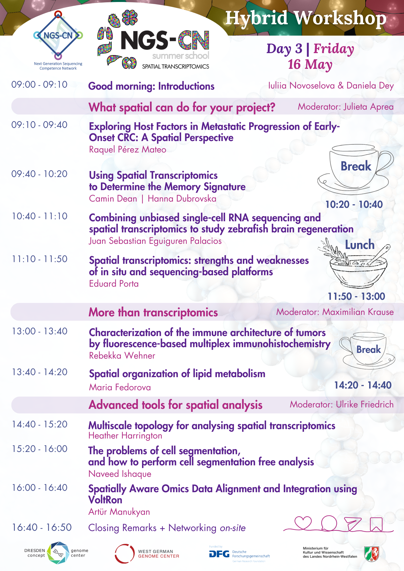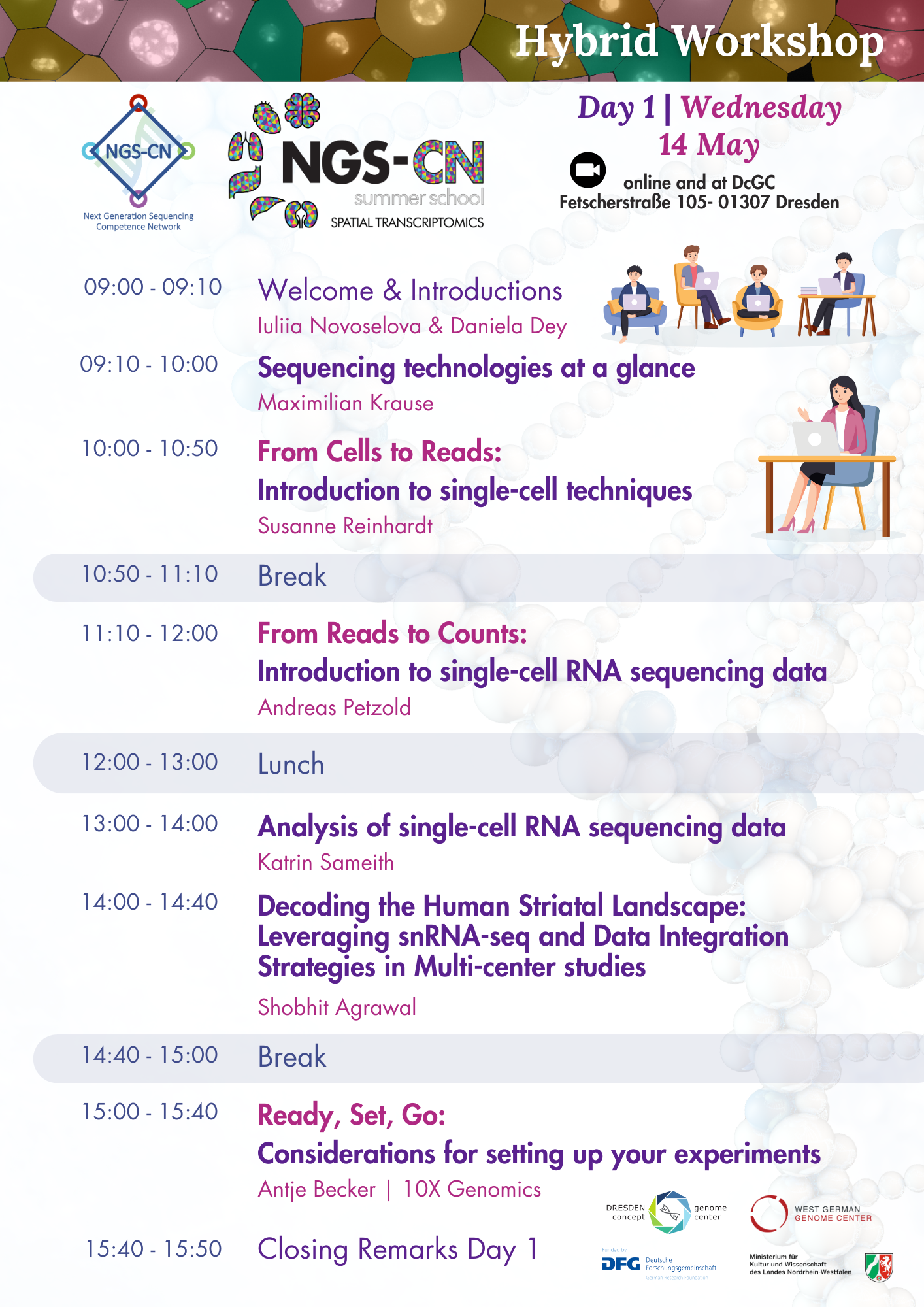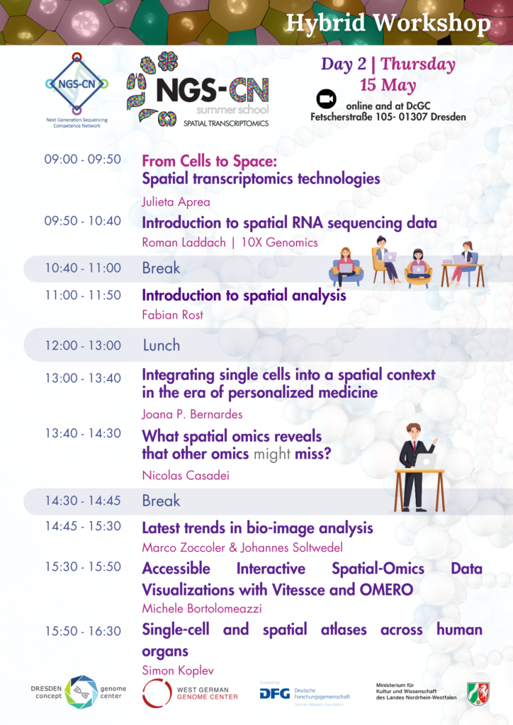 The Next Generation Sequencing Competence Network (NGS-CN), an initiative funded by the Deutsche Forschungsgemeinschaft (DFG), is proud to announce its 5th Summer School! taking place in May 2025. This round the course will focus on training young researchers in the cutting-edge field of spatial transcriptomics (with some content on single cell transcriptomics).